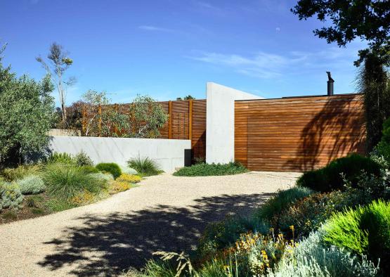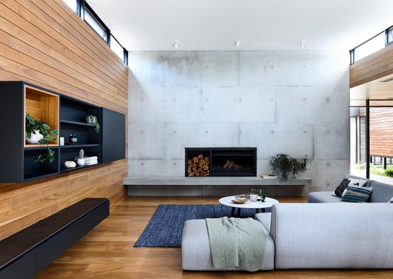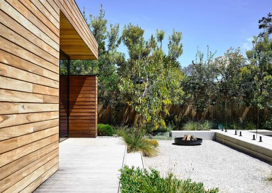 In the ocean beach environs of Blairgowrie on the Mornington Peninsula, this house presents itself as a robust, tactile and refined combination of timber and raw concrete. Its understated presence embraces the coastal streetscape through the extensive use of natural timber, sitting harmoniously amongst the tones of the local indigenous vegetation, whilst privacy is created through a thoughtful combination of solid walls and operable timber screens. Connections into the house and through to the outdoor spaces are accentuated by continuous material links such as the blackbutt wall and ceiling linings, providing a warmth and softness to the interiors, offsetting the bold concrete elements. This consistency of material is continued throughout the house, with clear finishes used on all the blackbutt surfaces to exhibit the natural character of the material. Structurally, timber was used extensively, with LVL and glulam in particular used for their efficiency and structural flexibilities.