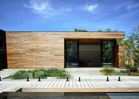 Cladding: Solid timber profiles and solid timber battens in blackbutt. Timber was used for the relaxed feeling it can give to a building, for it's ability to settle into the surrounding landscape and natural environment in a seamless manner and for the visual warmth it adds to the building.