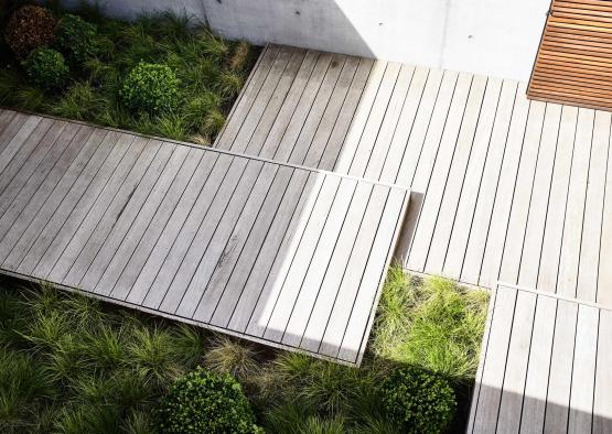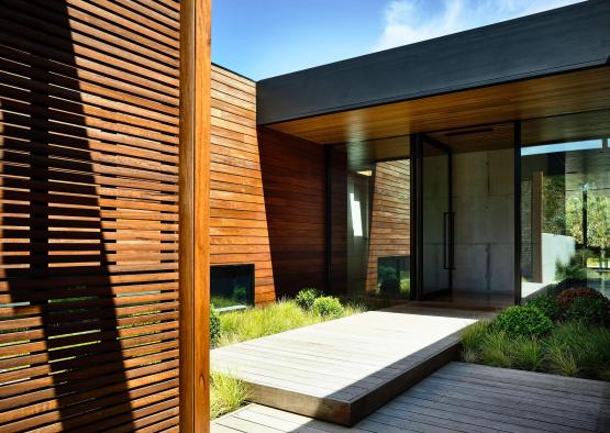 Vertical Support or Wall System: Glulam vertical supports support the screening elements, and are clad in solid blackbutt. LVL and plywood formwork for in-situ concrete walls.