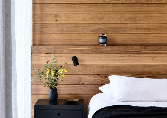 Interior Panelling: Timber veneers used on study. Shiplap cladding was used in the master bedroom and living room. Timber ceiling lining was used in the kitchen, hallways and living room. Blackbutt veneer and blackbutt shiplap cladding were used throughout the interior.