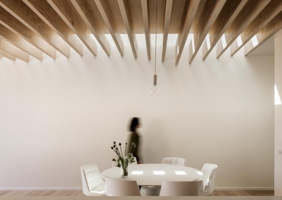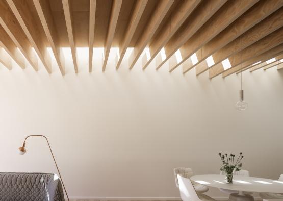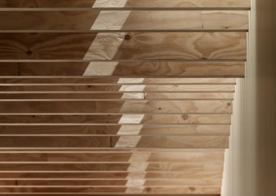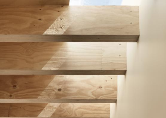 Screen: Hoop pine LVL structural member utilised as a sun shading/diffusing element underneath the glazed skylight.