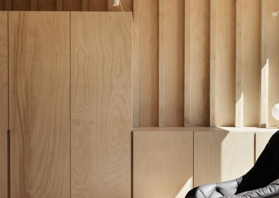 This project consists entirely of renewably sourced, plantation grown timber. The project is a suggestion of how small residential projects, which make up the vast majority of construction in this country, can become a key contributor in our journey towards becoming a more sustainable society. The exposed roof structure is hoop pine laminated veneer lumber. The ceiling and wall cladding is exposed hoop pine structural plywood bracing. The joinery is A grade hoop pine plywood throughout. The timber framing is Radiata Pine. The floorboards are Vic Ash. Less sustainable and rare hardwoods have been avoided entirely. This disciplined approached is intentional, to show that an attractive and comfortable outcome can be achieved with sustainable and modest materials.