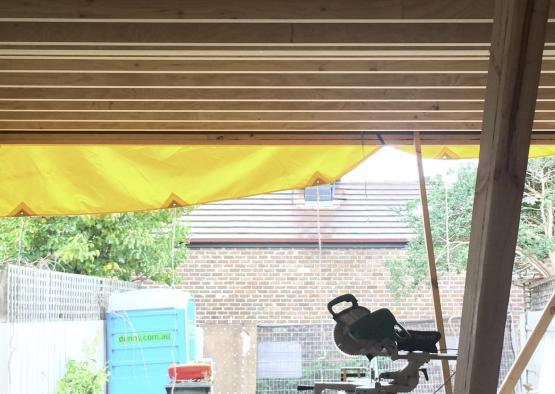 LVL was utilised for the portal frames/roof structure throughout. Structural elements are employed as the main expression of the building fabric and define the experience of the new space. The rhythmic variations in the depths of the rafters provide figuration and delineation to the living, dining and kitchen spaces. The structure and cladding of the extension is almost entirely of a singular material – laminated hoop pine – acting as a unifying texture. In the existing cottage, cornices and roses of the Victorian ceilings served as ornamentation as well as a means to define a room or space. This approach was appropriated for the extension, where the roof structure is utilised expressively. To achieve this, the roof structure was exposed. It needed to span the full 7m width of the site without blocking pieces. In between the rafters, the plywood bracing was exposed as the infill cladding. Only by using hoop pine LVL and plywood bracing could a unified and consistent timber finish be achieved.