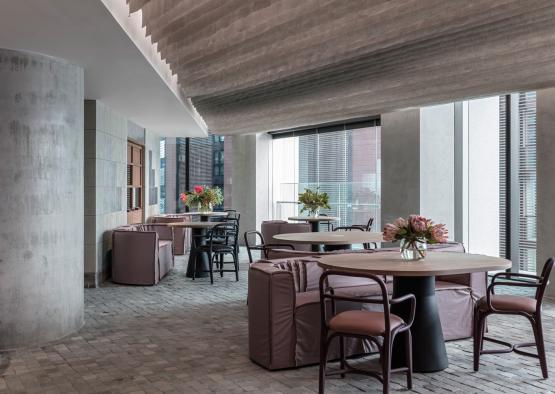 Furniture also provided textural depth, with the smooth timber lines of bespoke pieces working with contemporary interpretations of the Thonet chair and the bark like surface of ruffled seams in the loose fit leather sofas.