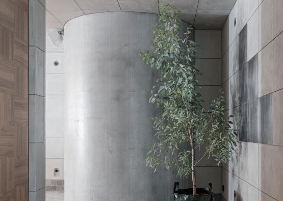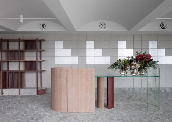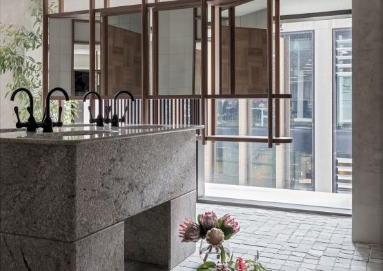 12-Micron explores a new Sydney aesthetic that is luxurious without ostentation. To this end a reduced palette drawn from the tonal variations of spotted gum: plum, soft greys, green and blue, have been used with a minimal material palette: fabric, leather, stone, timber, stucco and tile. Nuance and layered depths are created through textural variation, with the rough texture of the cobbled floor wrapping up to join the smooth grey of the orthogonal wall tiles, which in turn gives way to the floating fabric and vaulted ceilings. The lighting has been designed to provide light and shade.