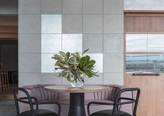 Located on Sydney Harbour at Barangaroo, 12-Micron is a restaurant which is evocative of place. Designed to draw on the colours and textures of a spotted gum forest, the interiors explore the concept of what is unique to Sydney. Textured cobbled floors, floating fabric ceilings and sustainably sourced spotted gum joinery with natural, limed and plum stained finishes represent the natural environment while a gridded overlay provides a contrast to represent the urban context.