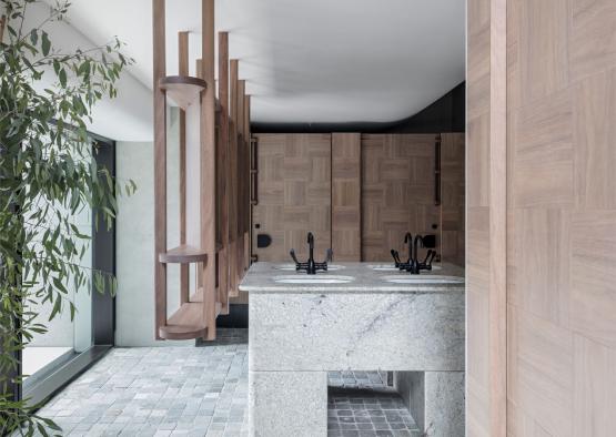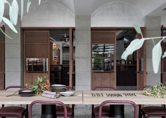 12-Micron is the 2017 winner of the Australian Timber Design Awards, Timber Veneers category. The restaurant uses natural materials to represent how the environment contrasts and interacts with an urban context.