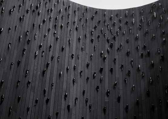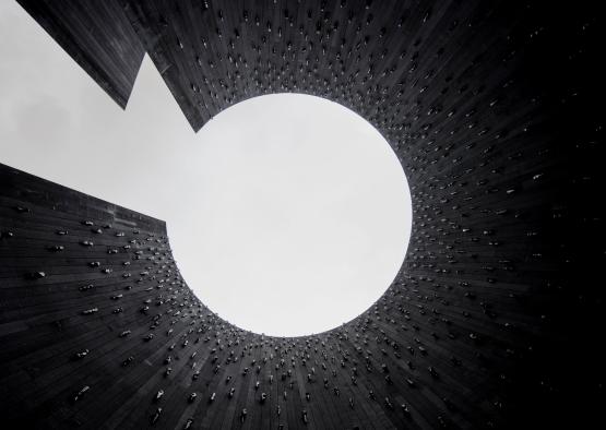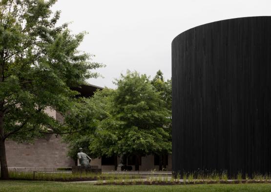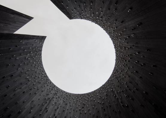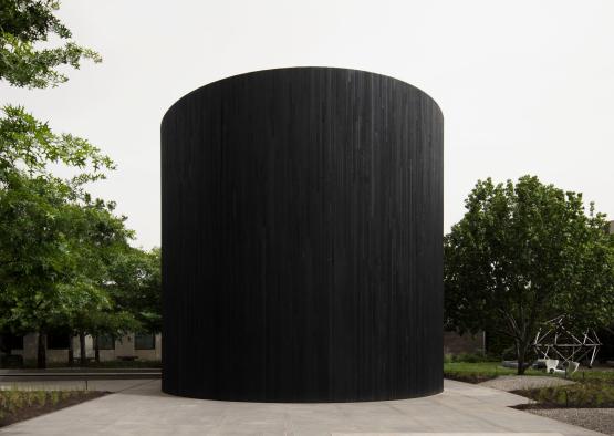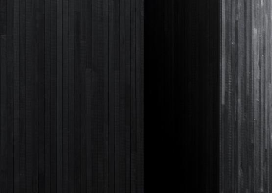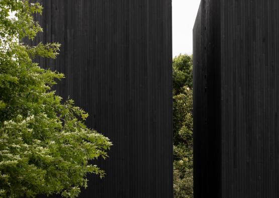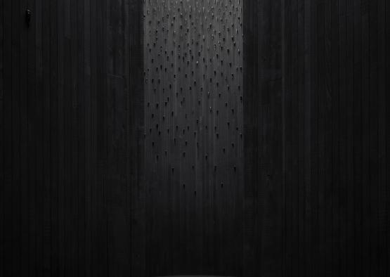 The materials used to construct the work were purposefully singular, with black-stained, rough-sawn Tasmanian timber boards wrapping the entirety of the structure. This singular textural element established the strong physical presence of the work and that of the carved-out spaces within as the site of interaction for an audience. From inside the work, this dark, textured surface frames the theatre of time and of sky as its penetrating sunlight drifts down and across the two central chambers as if in a slow and synchronised dance.