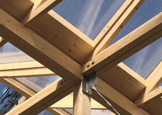 The gridded glulam post and beam system was fixed with bolted plate connections, which also incorporates cross bracing. The bolted connections provide a simple system for disassembly at the end of the structures life.