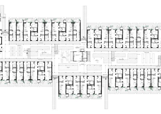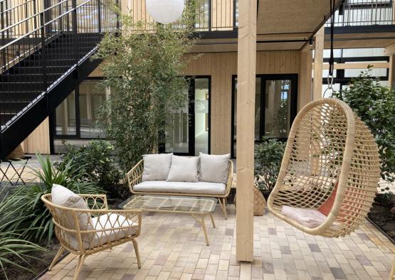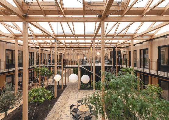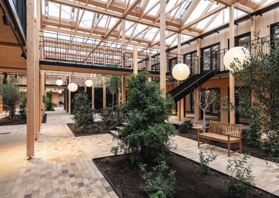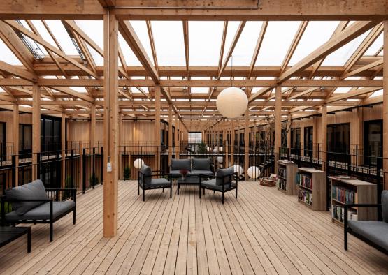 The outside of Agorahaverne notably contrasts the light interior timber of the apartments with a dark exterior. The timber cladding is made from charred timber planks, which is an ancient technique of timber preservation.