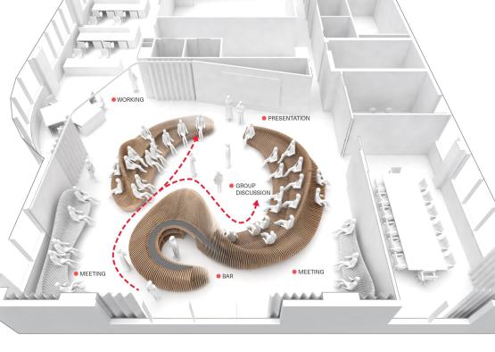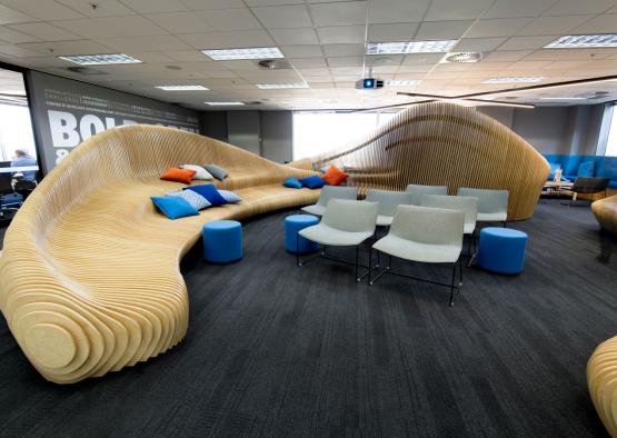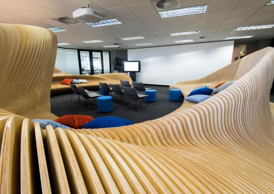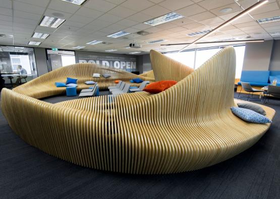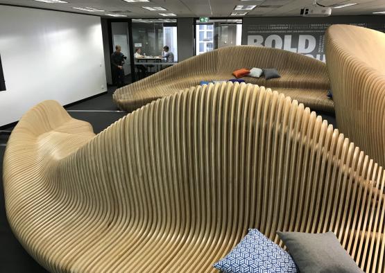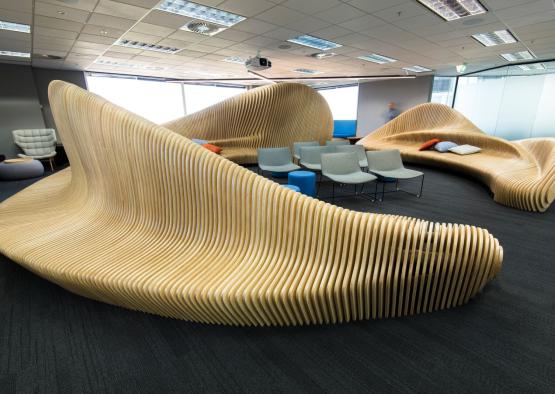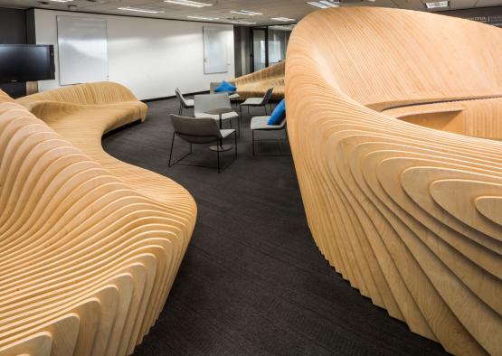 An organic, sculptural presentation zone in a Melbourne office interior.