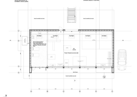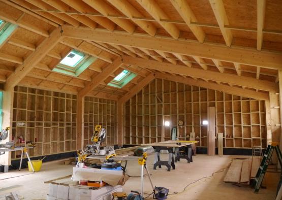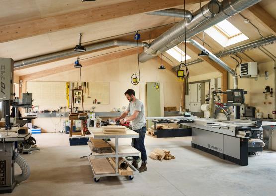 Glulam frames run in a smooth rhythm from the workshop floor to the roof ridge. The engineered timber was necessary to achieve the large uninterrupted spans across the workshop area, whilst still allowing the form to be conveyed. The new building houses a full timber workshop facility combining traditional wood-working machinery and hand tools, with a 5-axis CNC milling machine.