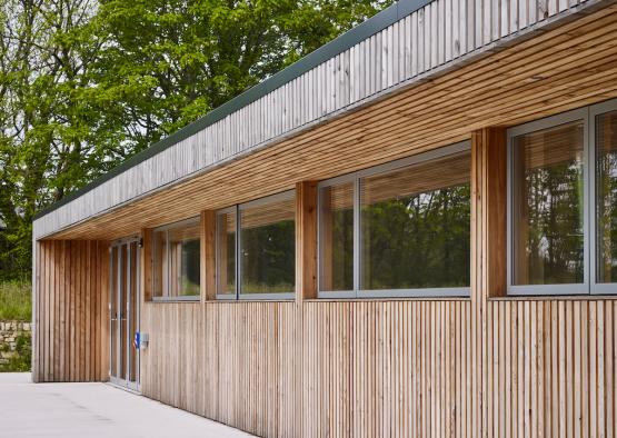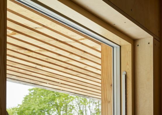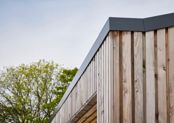 Timber is used in its different forms throughout the structure, with an engineered glulam structure made from laminated boards of pine. The glulam proudly expresses its joinery, while larch clads the exterior and plywood lines the internal spaces.