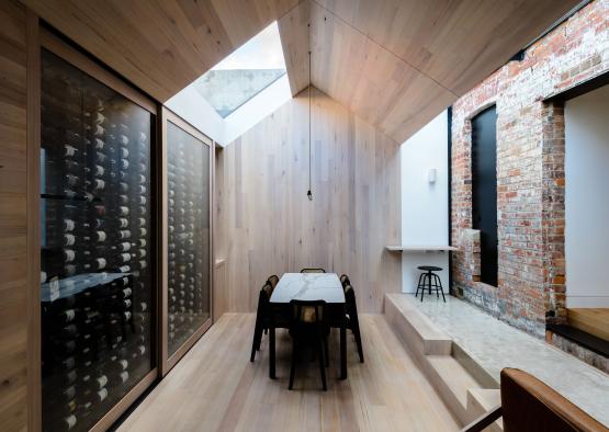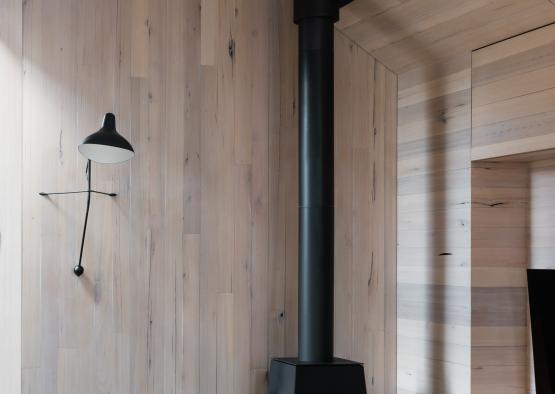 The Tasmanian oak lining in the main living space was initially considered to be out of budget for the extension. A serendipitous search for a cheaper option led to a local supplier offering up-cycled timber deemed below grade for mainstream supply. The irregularities of the timber heightened the character of the material through grain and shadow. It also meant a perfectly good material destined for lower grade usage could be utilised in a considered way.
