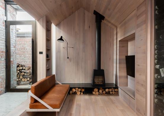 The Tasmanian oak lining became the main feature throughout the extension, integrating into the walls, floor, ceiling and joinery. Custom built in seating features a steam bent Tasmanian oak backrest, showcasing the workability and craftsmanship possible with the material.