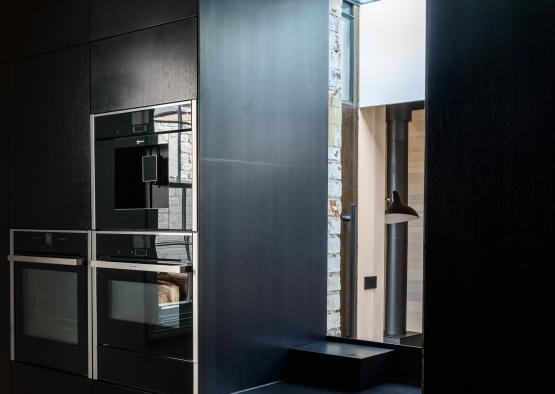 Black stained oak veneer kitchen joinery matches with the black stained rear glass door, both contrasting beautifully with mild steel frames, providing a highly contemporary feel for the workers cottage update.