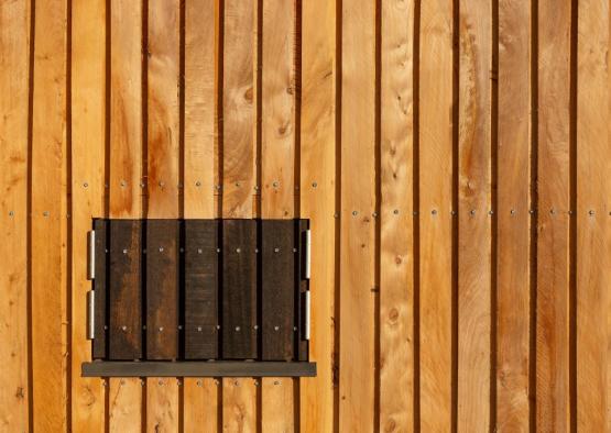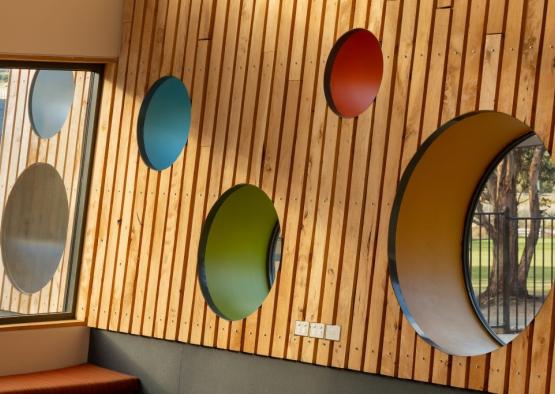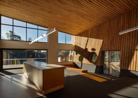 Rough sawn macrocarpa timber boards were detailed with expressive fixings to create a rustic aesthetic and tactility to the learning centre. Choosing rough sawn, knotty timber, meant more of the boards were utilised and saved from wastage. The vertical boards comply with the required BAL 12.5 rating of the site, and match the natural wooded setting. A cantilevered bench seat and specialty puppet theatre window utilised dark-stained blackbutt timber to comply with the extra structural requirements for the BAL rating. The puppet window allows pre-schoolers to undertake shows whilst parents watch on.