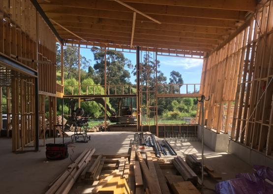 Original plans to use steelwork to form the double height entrance lobby were designed out to make way for timber construction. Timber posts and LVL rafters were specified with minimal steelwork to create the high volume. Eliminating the steelwork created a faster construction time and kept costs down. Hardwood and structural pine, along with the macrocarpa cladding were all sourced from the Tasmanian midlands.