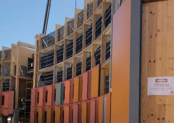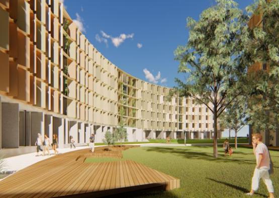 The design aims to foster residential life and campus communities by reducing a large-scale development into finer grain and human scale experiences. The building will achieve a 5 star Greenstar as-built rating, and a significantly low carbon footprint: a 76% lower Global Warming Potential (kg of CO2 equivalents) than the corresponding concrete-based design.