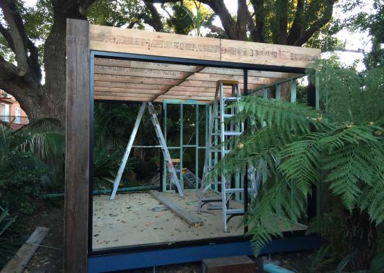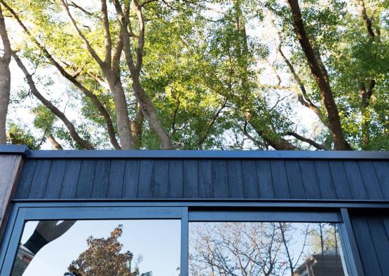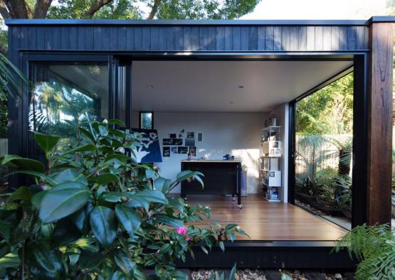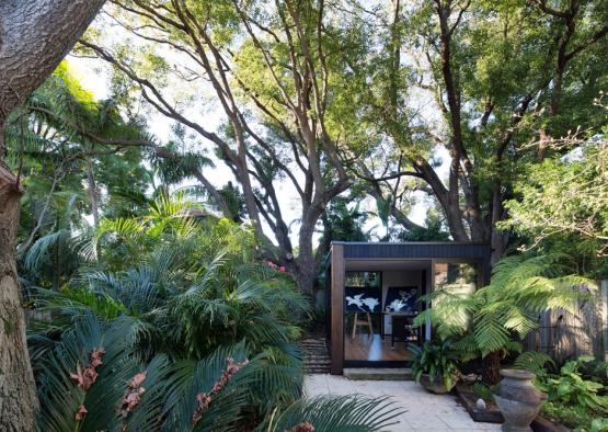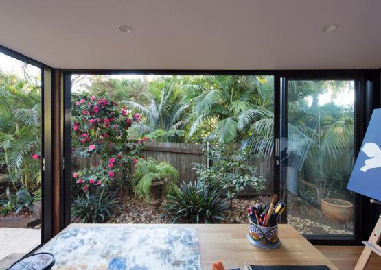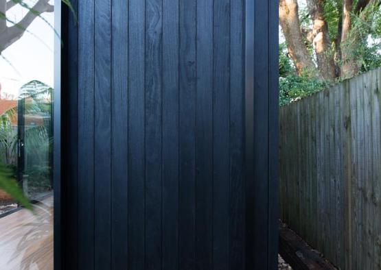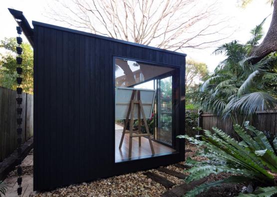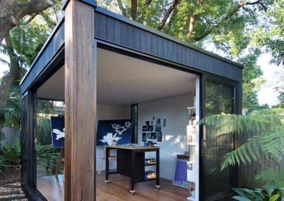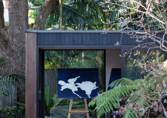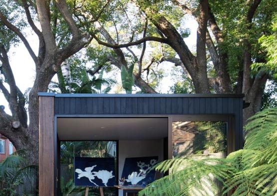 The brief was for a minimalist painting studio set beneath the camphor laurel canopy of a suburban garden in Sydney's inner west. The concept was for a jewellery box of a building with impeccable detail. Charred hardwood cladding was used to help the building age gracefully in place, the dark tones and scaly texture helping it to gently merge with its tranquil natural setting. Hardwood tongue and groove floorboards bounded by large glass sliding doors complete the effect of bringing the garden into the space and inspiring the artworks that will occur within. Engineered timbers are used for their superior trueness and spanning capacity in the timber framed floor and roof structures. Finally, a recycled iron bark feature column grounds the building by tying in with timber tones in the floor and external sleeper ground treatment, as well as physically bracing the building and being cost efficient.