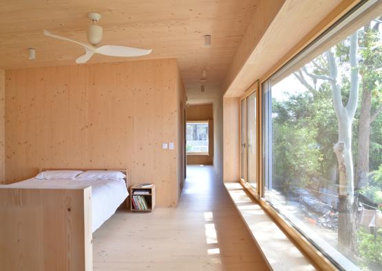 Timber cladding also allowed the architecture to express externally what is the essence of this project. The cladding not only references the structural and internal materials, but also the exterior environment, surrounded by eucalyptus.