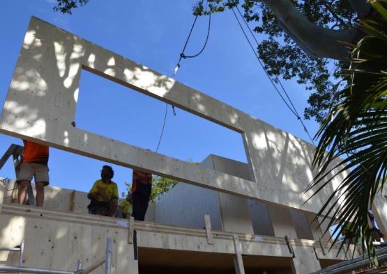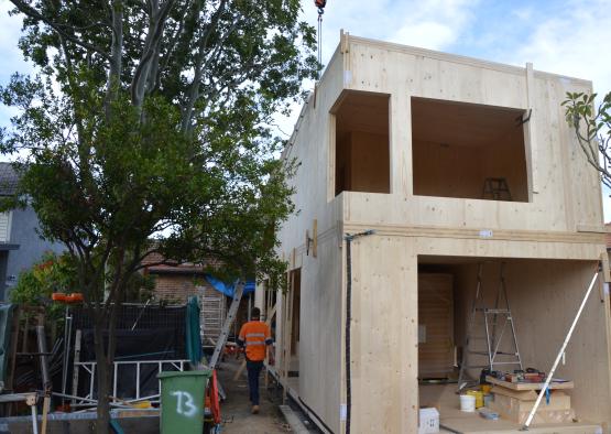 The cross-laminated timber (CLT) structure was prefabricated offsite, including the stair and cut-outs for lighting, power and equipment, and installed in just 15 hours. Within 10 days the building envelope was airtight, insulated and waterproof, so all other trades could continue internally without being exposed to the weather.
