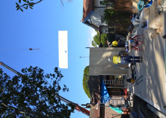 The project site was located at the back of an extremely tight site with little access. On top of this, the clients were still occupying the existing house. A prefabricated structural system was decided upon to create minimal impact on their lives.