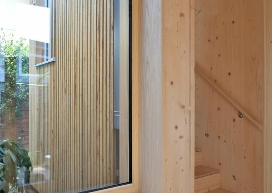 The interior of the building features exposed CLT timber walls, floors and ceilings. In combination with the heat recovery ventilation system, this will ensure a healthy natural indoor environment.