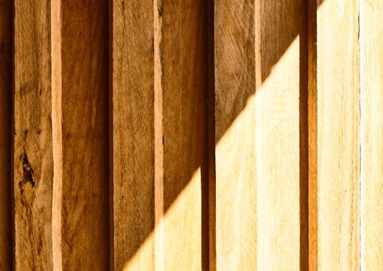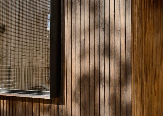 The exterior cladding is mostly board-and-batten silvertop ash. The radially sawn timber has a rough finish, subtly hinting at the ecological focus of the design. The timber boards have been set back below the decks, creating an illusion of separation between the floor and walls. The vertically set boards emulate the growth of the surrounding eucalypts, and produce a play of light throughout the day.