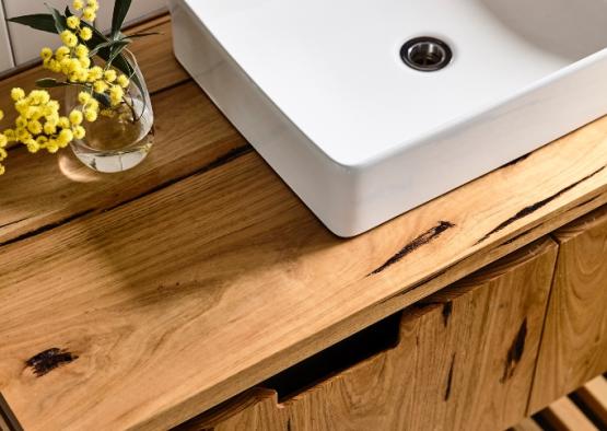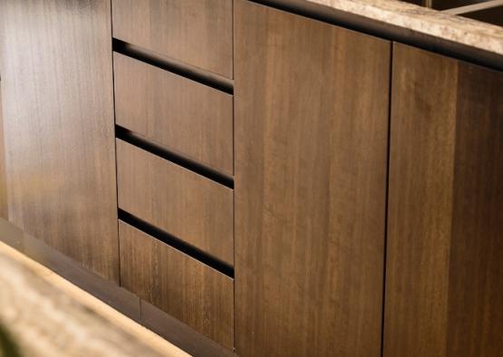 Timber joinery is used throughout the kitchen and bathrooms, with a variety of tones and species used.