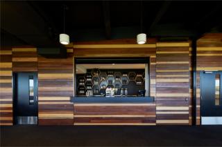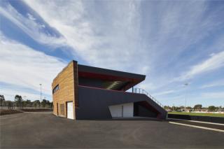 The striking, geometric wall emerges from the landscape, comprising equal proportions of grey ironbark, spotted gum and stringy bark. Its curvilinear form in plan is the starting point for the stadium that contains the grandstand with 500 seated capacity, conference and catering facility for 200 people, external viewing decks and players' change rooms, media rooms, and sports administration facilities.