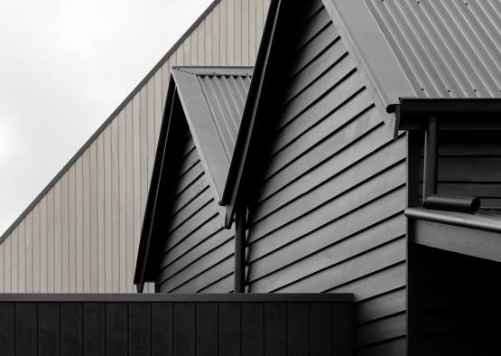 Weatherboards with paint finish were used for the existing cottage, contrasting with the more refined vertical shiplap silvertop ash with a custom stain. The weatherboards were retained for the cottage due to their heritage appropriateness.