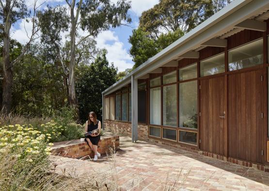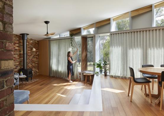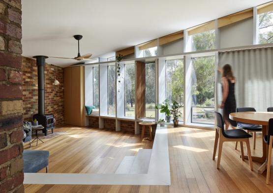 Reused Victorian ash timber from the previous structure was used for flooring, and recycled blackbutt timber was used for doors and windows. The architects add that ‘reusing timber flooring from site does not require justification, it is sustainable, has character and tells the story of using the site’.