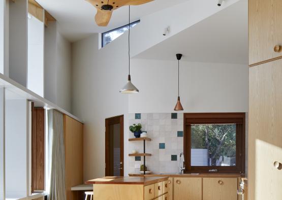 Joinery and cabinetry was crafted from birch ply, Victorian ash veneer and the LVL structural elements. Vic ash veneer was used for its subtle aesthetic qualities in line with the ethos of delivering a modest, simple and subtle building, with qualities that reveal themselves over time. Timber and paint colours were all matched for the quality of light they reflect throughout the day, together harmonising to form an overall sense of tranquility in the space.