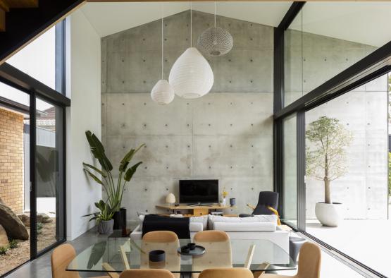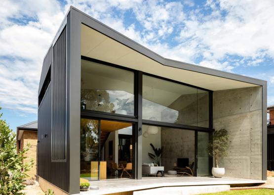 A pinched roof profile on the northern facade of the addition provides ample cover, while allowing the sun to penetrate the large wall and floor concrete mass to regulate temperatures throughout the day.