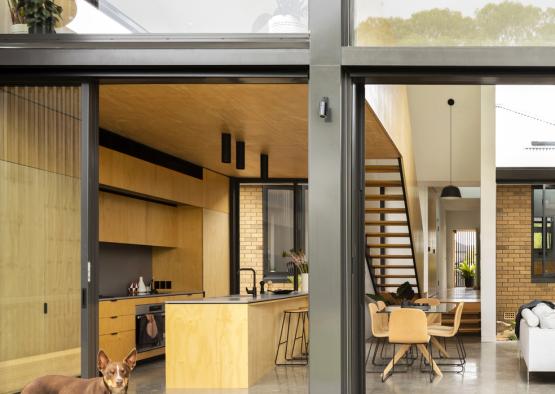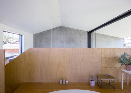 Honey coloured hoop pine plywood forms a major part of the interior lining, and is contrasted with the colder and more modern and sleek grey concrete. The two colours reference the existing colour palette from the main building. The honey coloured ply was carefully considered to match the brick colour from the 60’s building. Blackbutt T&G boards were used as the flooring, and for the stair treads, and were treated with a natural oil finish. Joinery was made from a combination of solid and honey coloured ply timbers.