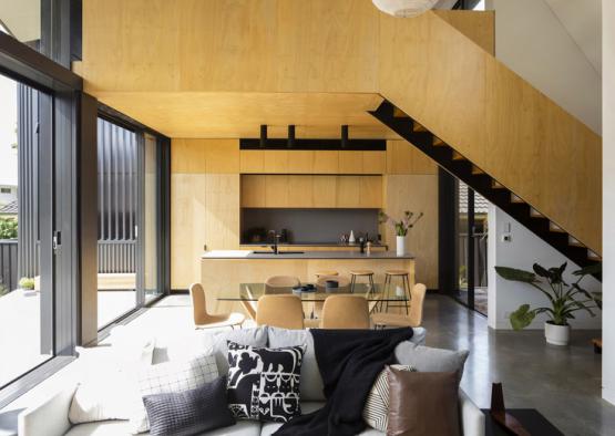 The feature plywood clad stairs extend the established circulation path from the original structure’s entry point.