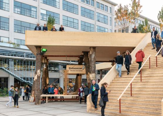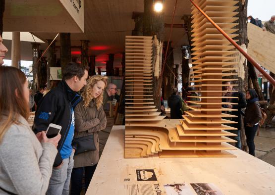 The pavilion takes a strong stance on the construction industry’s large scale contribution to climate change through emissions, particularly concrete production. Biobasecamp presents CLT mass timber as the ‘concrete of the future’.