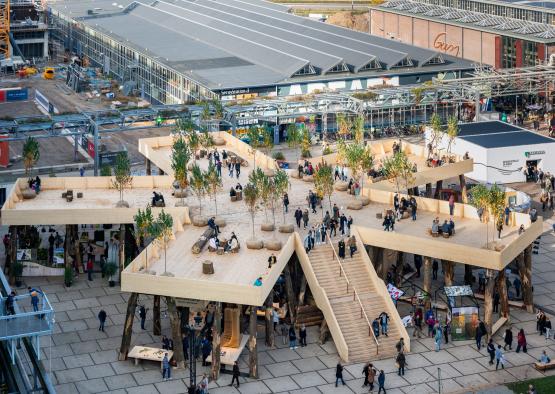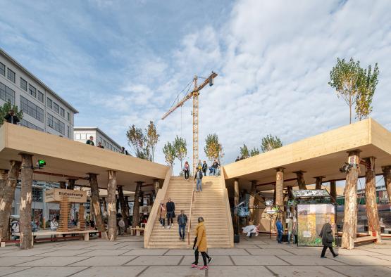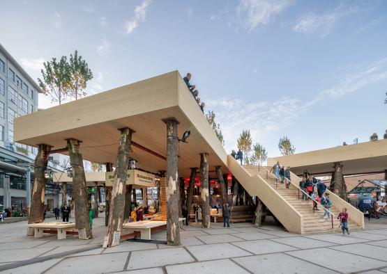 The CLT roof is supported by pillars made from the raw trunks of poplar trees, which have been taken from the motorway between Den Bosch and Eindhoven. The roof structure also acts as a second storey roof deck. The trees were destined to be cleared from the edge of the road for road anyway, for safety reasons due to their age. The trees were salvaged for the pavilion and re purposed in a meaningful way.