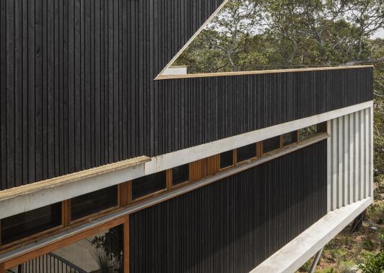 The charred timber box is set between expressed horizontal concrete planes which make up the floor plates. The result from the exterior is a clear expression of levels, with the timber defining the habited, and the concrete defining the structure.