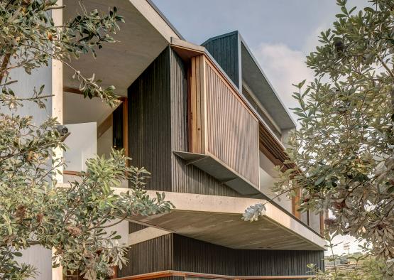 A significant overhang from the second storey forms a carport below, with the floating elements elegantly supported by a twisted steel support.