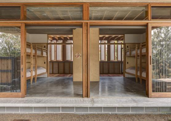 To enhance the ambiguity between inside and outside, ironbark decking with corked joints was used for flooring, and charred external timber cladding was used to line the walls leading to the bedrooms.