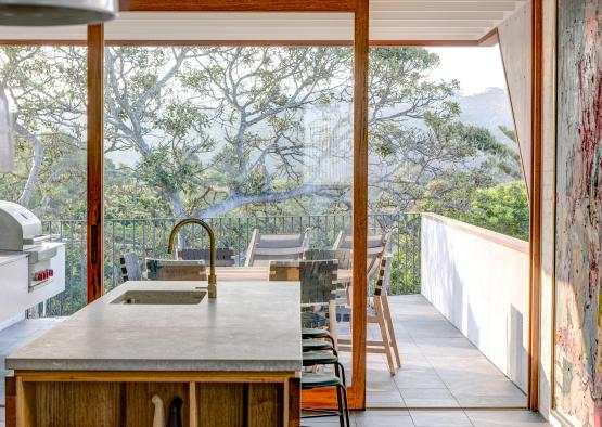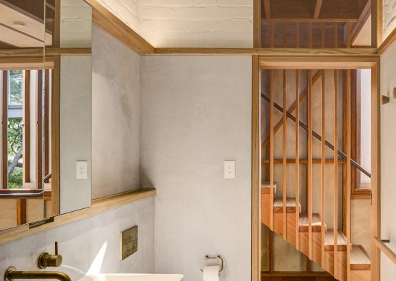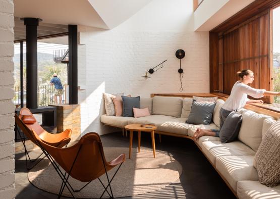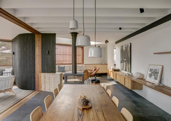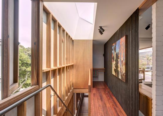 Hoop pine panels were used to line the ceiling, nestled in above the exposed hardwood joists. The hoop pine has also been used for custom fabricated sliding doors to the bedrooms, and was edged with blackbutt.