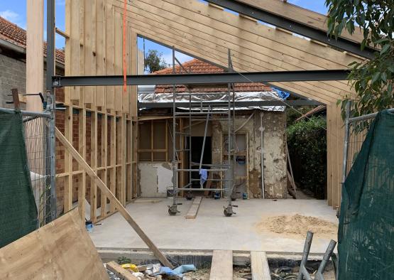 LVLs were utilised for the expressed structure of the addition. Both the studs and the rafters were designed to utilise LVLs, and were expressed internally, rather than enclosed in interior linings. The wall studs and rafters were designed to be the same dimension internally, forming a series of expressed ribs that define the addition. There is an honesty of expression in the architecture- the timber structure is fully revealed and celebrated.
