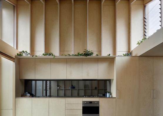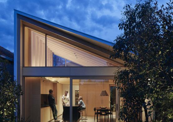 This residential addition showcases timber to create a warm and detailed space, in contrast with the retained brick portion of the original Edwardian terrace house.