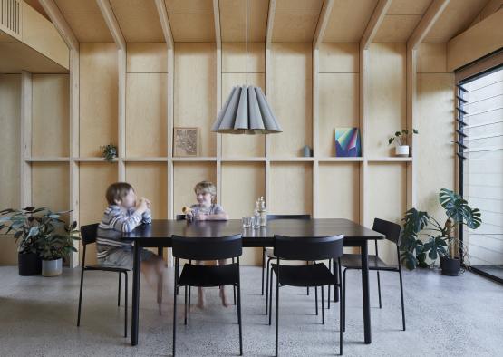 European standard EN635-2 and FSC Certified birch plywood was specified for the joinery and interior linings. The design of the addition was set out to align with the standard plywood panel modules, so any waste of materials was minimised. Full and half sheets of the plywood panels could be utilised to line the walls and ceiling in a considered pattern and set out. Off cuts from the LVL expressed beams were utilised as a timber shelf along the western wall of the dining area, once again ensuring minimal waste.