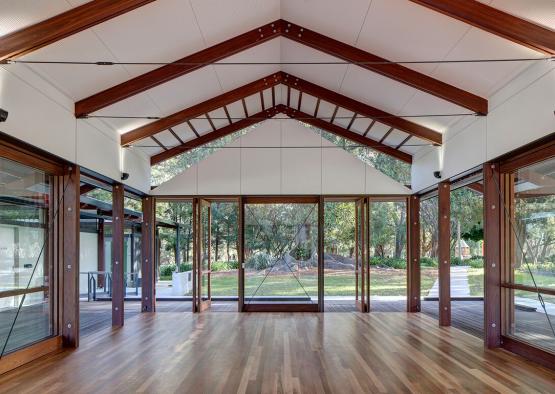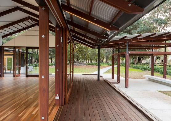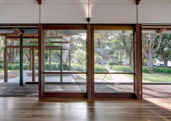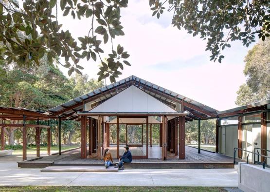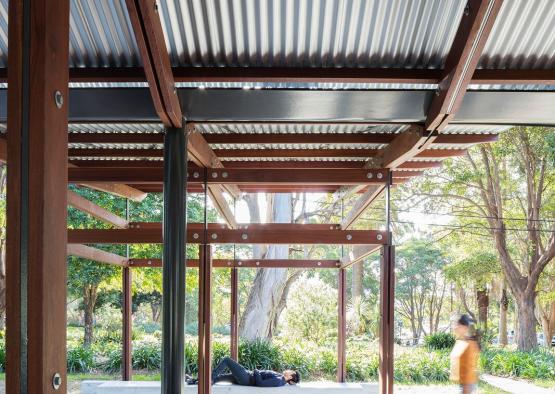 The Cabarita Park Conservatory expresses itself in the form of a lightweight pavilion, nestled amongst the trees and adjoining buildings. The glass wrapped structure provides spectacular views and gathering spaces in every direction, including a beautiful Moreton Bay Fig tree to the west, and the Paramatta River to the east.
