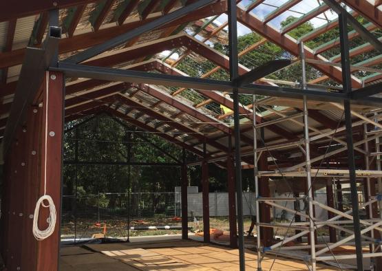 The structural system is a hybrid one, utilising both steel and the recycled timber members to ensure efficient material use. Slim steel fins are used as reinforcement for the timber at critical joints and fixing points. This technique was used on both posts and rafters. Paired timber members sandwich the thin bits of steel, creating a composite member with high strength.