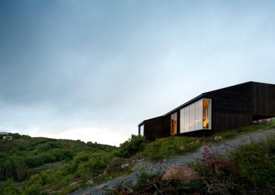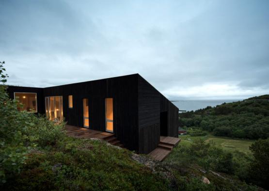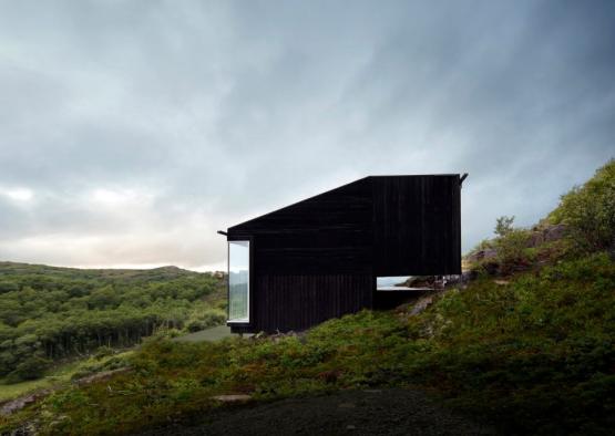 The black stained timber cabin was designed to minimally intervene on the rugged landscape adjacent to a Norwegian lake. The simple cabin is instead at the service of the two contrasting views sweeping around it - the lake to the west, and the seemingly endless green vista to the east.
