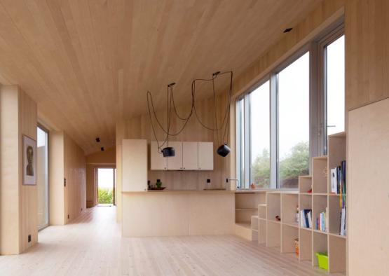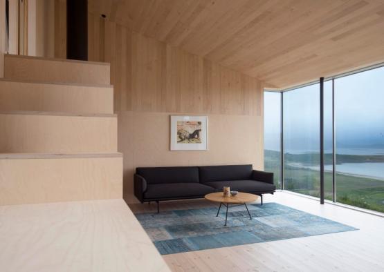 The soft yellow timber lines the entire interior, contrasting starkly with the rugged black of the exterior, and providing a mellow solace on the interior. The simple palette furthers the concept of a uniform interior volume, common in Scandinavian architecture.